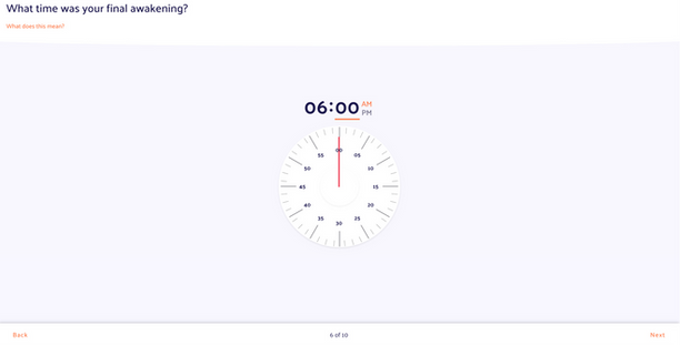 The next step was mid-fidelity mockups using Figma for user testing. Here, we referred to classmates and professors to go through the mockup and tell us when something worked, didn't work, was confusing, etc. This phase led us to make many changes, such as removing the analog clock interface all together and leaving the arrow buttons to choose wake up time, for example.